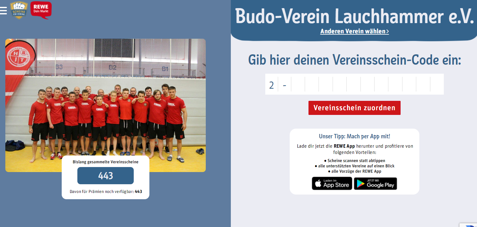 Folgt dem Link https://scheinefuervereine.rewe.de/drückt den Button Vereinsschein zuordnen und gebt ein Budo-Verein Lauchhammer e.V.